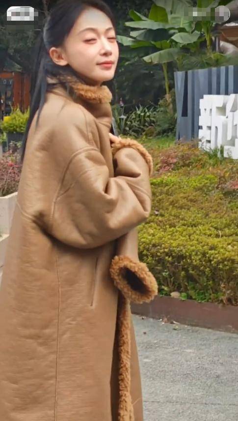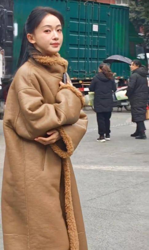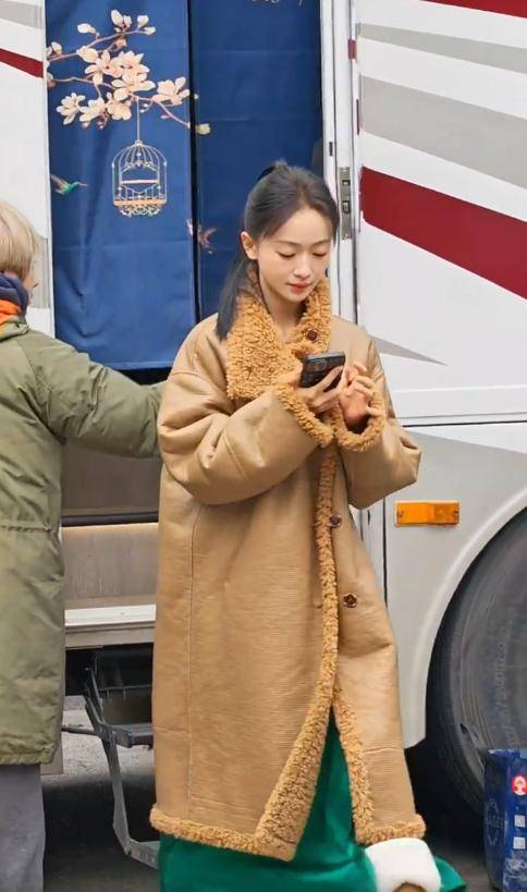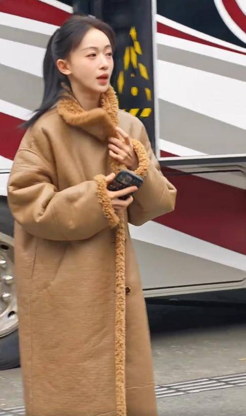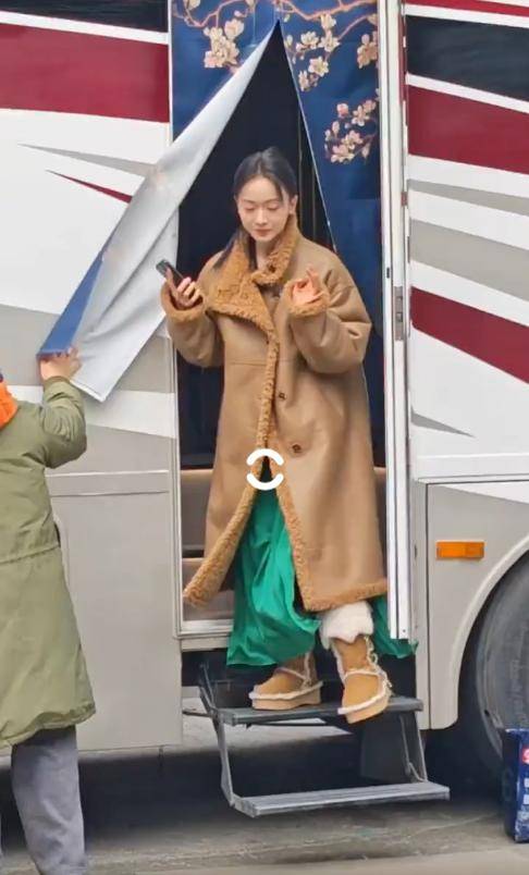 外面套着一件长款棕色外套,裹得比较严实,应该是为了抵御片场的寒意。她头发打理得整齐,身形依旧保持得极瘦。