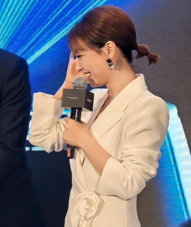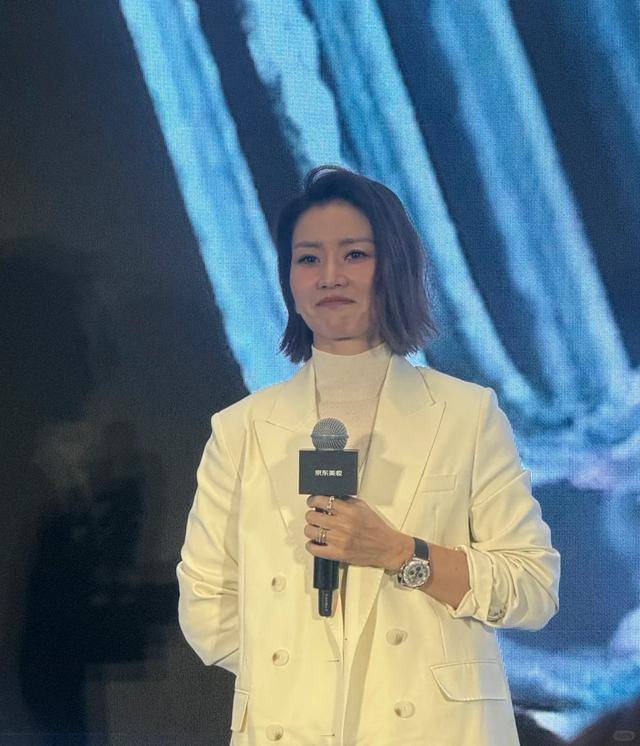 脸上不仅水嫩,而且特别有光泽感,灯光打在脸上的时候,简直就不像是43岁的人,脸上没有一点的赘肉,整个脸都是被骨相撑起来的。
