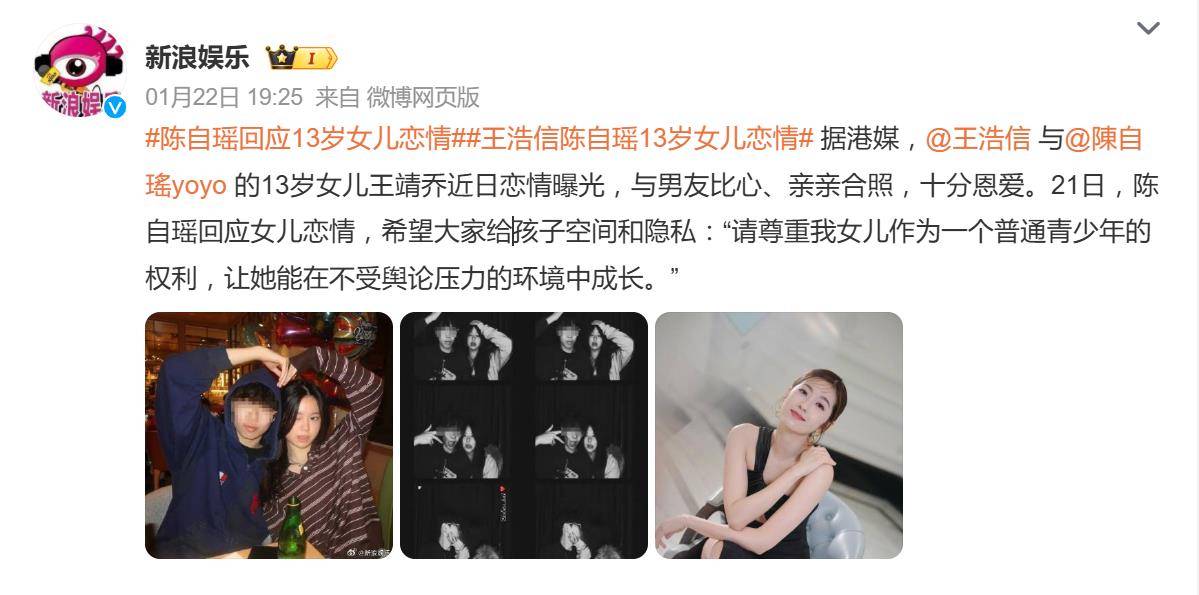 据1月22日报道,港星王浩信和陈自瑶的13岁女儿王靖乔,因为一波社交平台上的亲密合照,猝不及防地登上了风口浪尖。女儿与男友的比心、亲亲照片被网友扒出,瞬间引爆了关于“星二代早恋”和“青少年隐私”的全民大讨论。