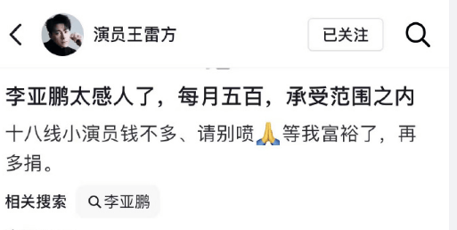 2026年1月21日,演员王雷方因被李亚鹏的公益行动所感动,他宣布以每月500元的金额向嫣然天使基金捐款,并开通自动续费服务,其谦逊表态"十八线小演员钱不多,请别喷"引发关注。王雷