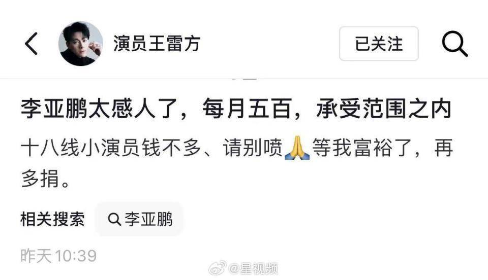 这位毕业于中国传媒大学的演员,演过《双枪》《红髅》这些影视剧,说起来也算科班出身的圈内人,但他在发文里把姿态放得极低:“李亚鹏 @一号立井 太感人了,每月五百,承受范围之内。十八线小演员钱不多、请别喷,等我富裕了,再多捐。”