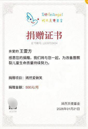 1月21日这天,娱乐圈的热搜榜被个 “非主流” 词条霸了屏 ——# 演员王雷方向 嫣然天使基金捐500元 #,紧跟着还有个 #王雷方每月500元支持嫣然天使基金 #的话题在旁边凑热闹。
