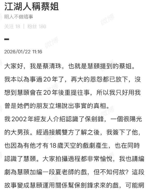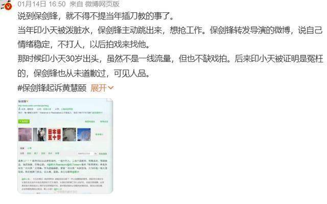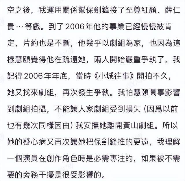 圈内有两个人站出来维护他,他昔日的经纪人蔡姐发了一篇长文,暗指黄慧颐太癫,至始至终没帮过保剑锋什么,还拖累他。