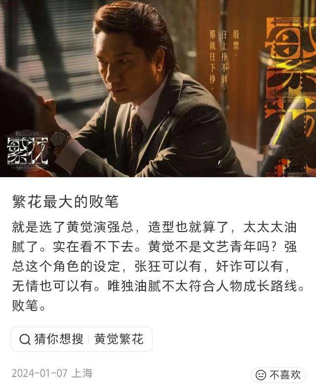 黄觉前几年还被捧成了“老戏骨”,这几年这样的恭维声逐渐减少了,有网友质疑他演戏全靠滤镜和氛围,演什么都油腻。