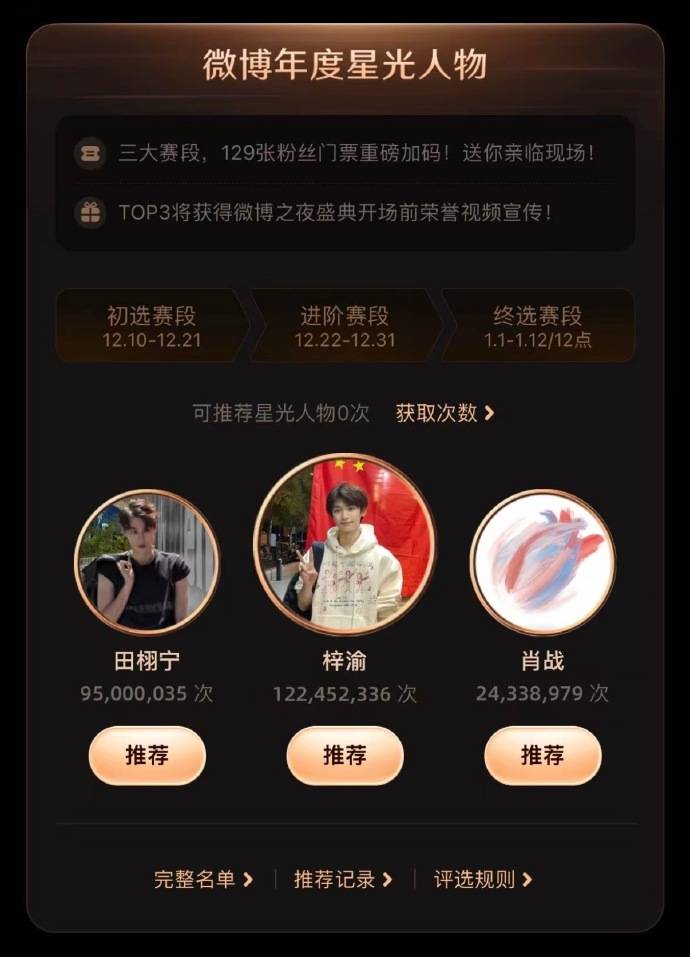 现在很多网友都非常好奇,微博之夜会邀请哪些明星,当名单还没官宣的时候,官方将榜单发出,让粉丝们进行打投。前不久,2025微博年度星光人物公布,梓渝、田栩宁、肖战入选。