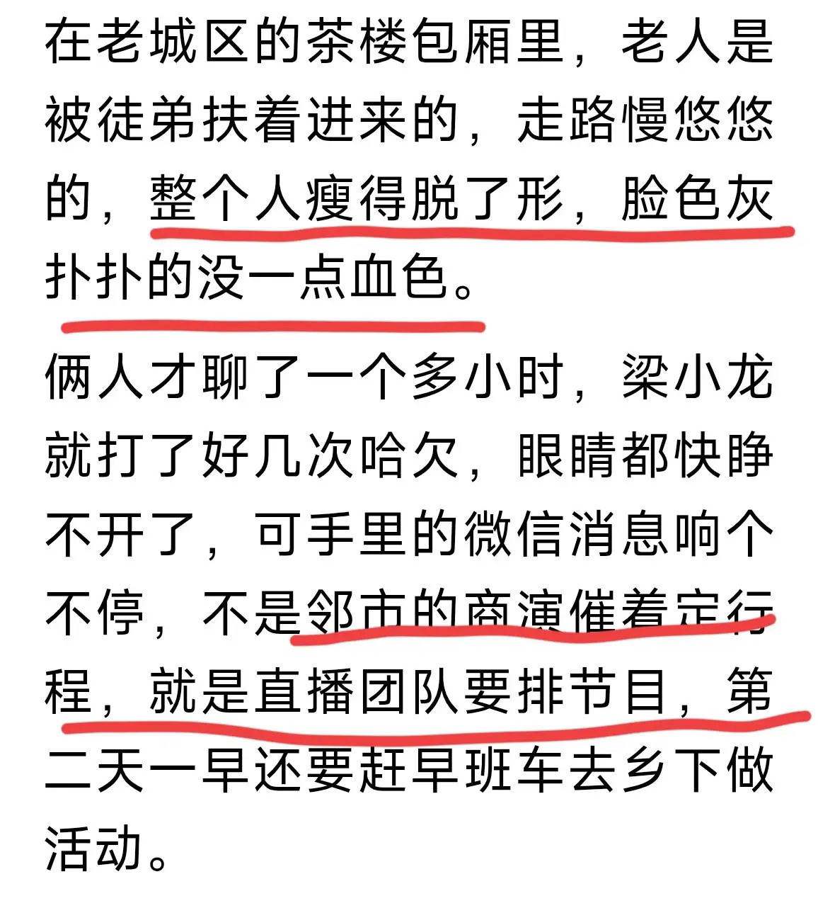 俩人才聊了一个多小时候,梁小龙就明显的体力不支,打了好几个哈欠,眼睛快睁不开了。可手机消息不停,不是商演就是直播排节目,催着定行程。