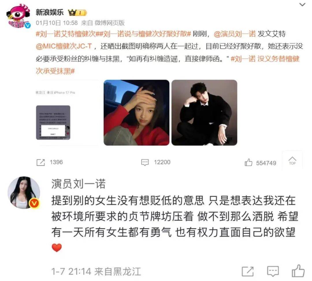 刘一诺在声明中刻意强调“已分手”的过去时态,就是要将公众注意力从“檀健次前女友”的身份,拉回到自己作为演员、歌手的职业赛道上。