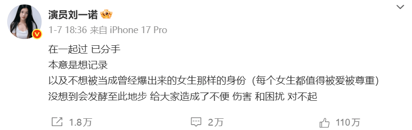 刘一诺的声明堪称微型范本。一句“在一起过,已分手”用过去时态,将可能持续发酵的恋情进行时瞬间转化为静态的恋爱过去式。