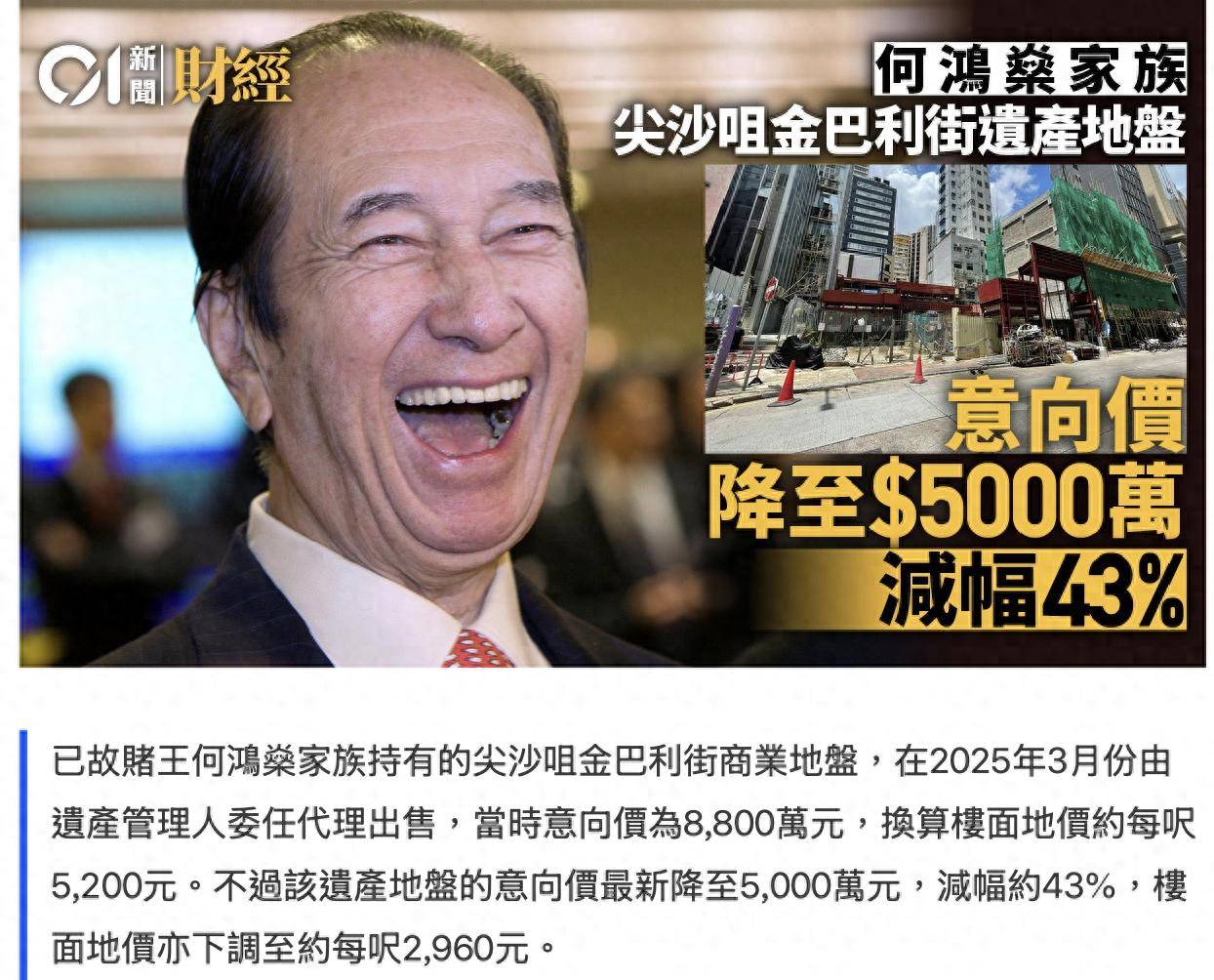 赌王何鸿燊在2020年离世,在离世之前,他名下的重要产业已经进行了妥善分配,所以实际上也没有太大的家族纷争发生。不过何鸿燊名下仍然有至少17.1亿的遗产,包括一些地块、房产没有分配,而他的遗产如今则是交由遗产管理人打理。2025年3月何鸿燊家族持有的尖沙咀金巴利街商业地盘,由其遗产管理人委任代理出售,当时叫价8800万,不过历时将近一年,这块地仍然没有卖出,如今已经降价至5000万,少了3800万。