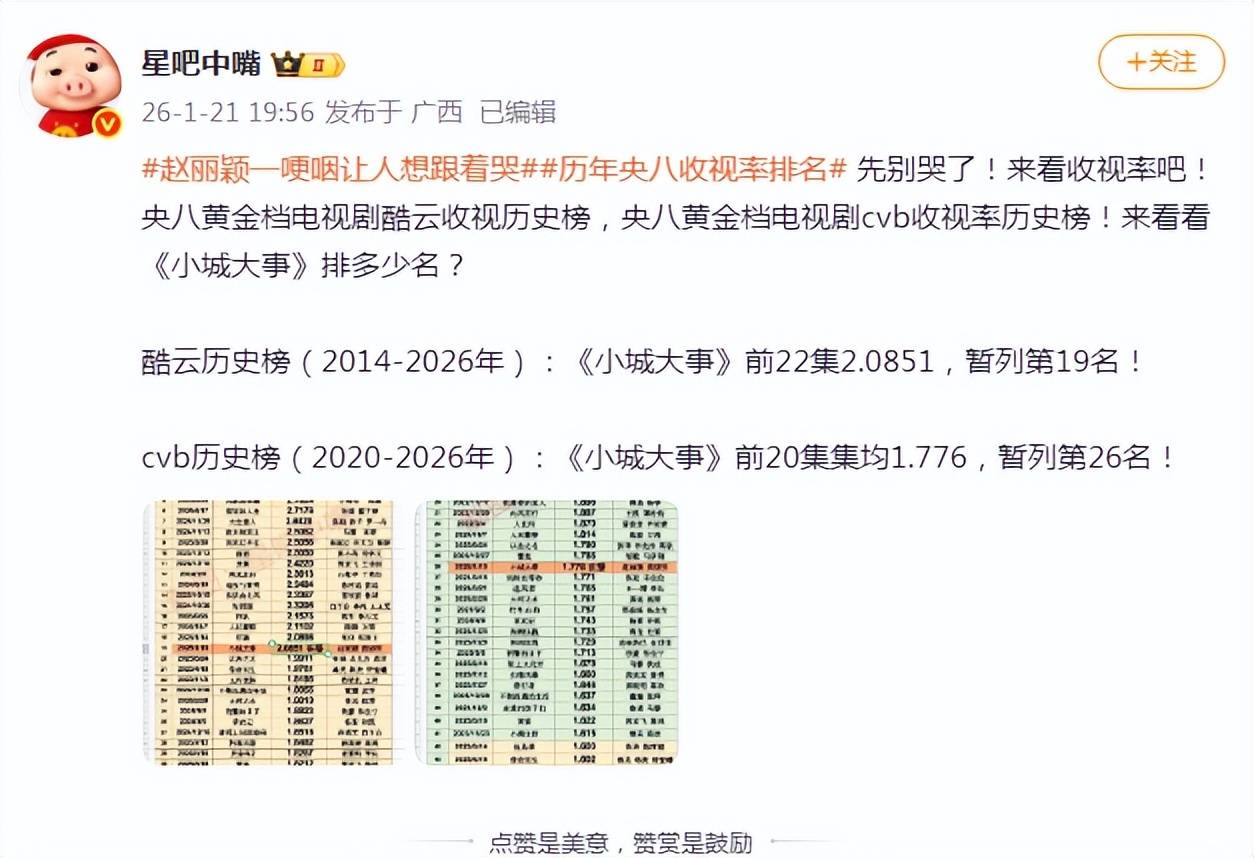 赵丽颖、黄晓明、朱媛媛主演的新剧《小城大事》收视榜单名列第26名,酷云排名19名,成绩不算特别强,但稳居中游。