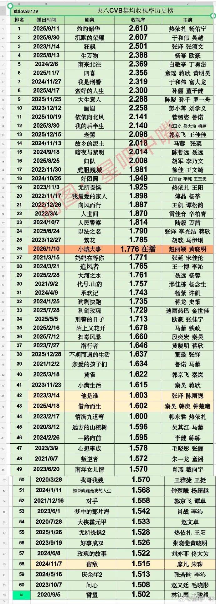 截至2026年1月,历史总榜以CVB集均收视率为核心标准,排名如下: