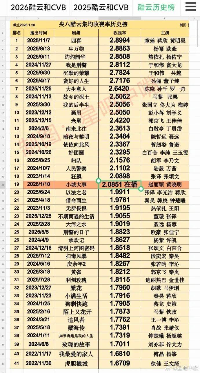 2025年多部爆款剧刷新历史榜单的格局,但不同统计维度的数据差异(如CVB集均、酷云峰值、CSM全国网)争议巨大,而2026年开年剧《小城大事》的亮眼表现,同样对榜单有所冲击。