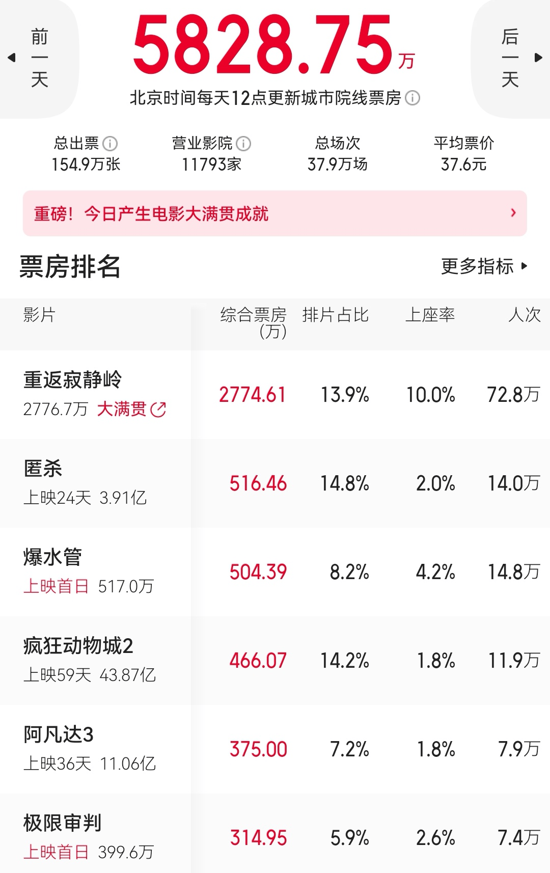1月23日,《重返寂静岭》《爆水管》《极限审判》三部新片上映,大盘票房回到了近6000万元。