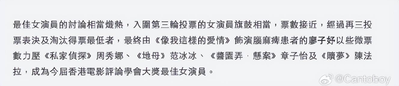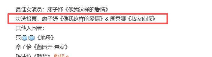 更让人替她憋屈的是,她在这奖的评分也不高,最后入围的五位女演员里,她排在了倒数第二,还排在了某个已经在内地被封杀的女演员后面。