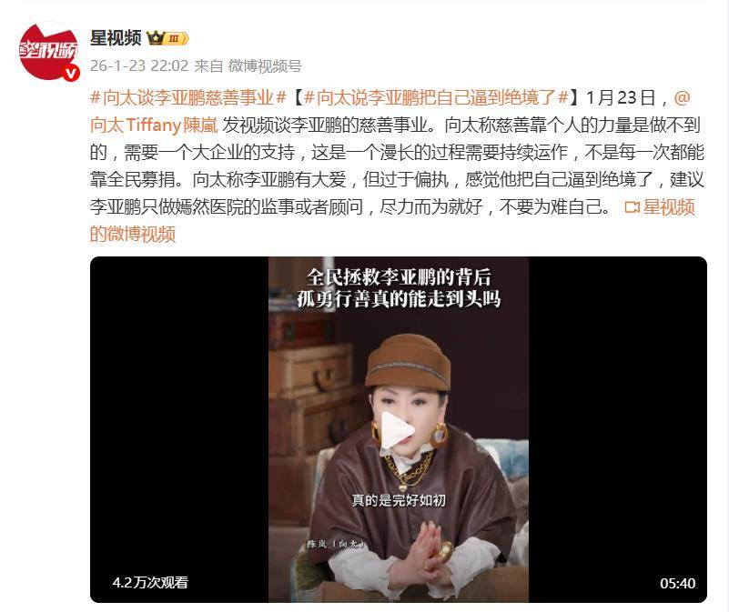 据1月23日晚间报道,一句“靠个人的力量是做不到的”,让向太陈岚对李亚鹏慈善事业的点评,直接捅破了公益圈那层理想与现实的窗户纸。这已不是简单的建议,而像一场关于