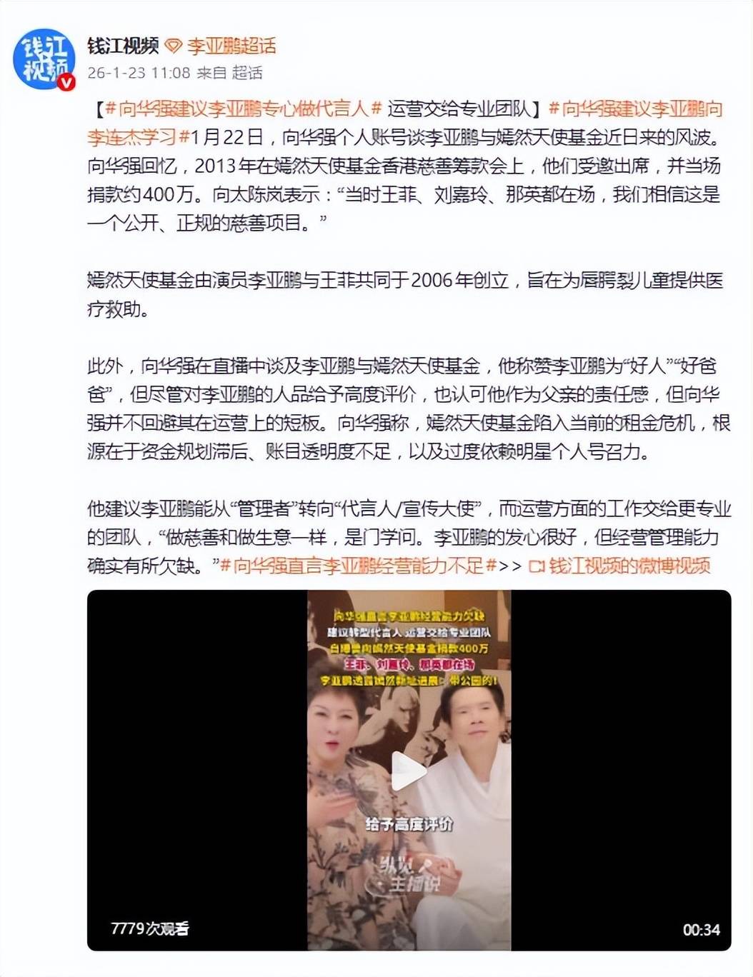 据1月23日晚间报道,一句“靠个人的力量是做不到的”,让向太陈岚对李亚鹏慈善事业的点评,直接捅破了公益圈那层理想与现实的窗户纸。这已不是简单的建议,而像一场关于“好人如何把好事办好”的公开诊断,在全民关注李亚鹏嫣然医院欠租困境的当下,激起了千层浪。
