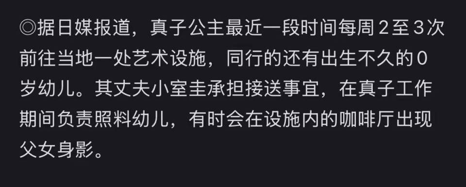 现在孩子出生后,真子公主又回到工作岗位,据说她正与该机构资深总监共同筹备新的艺术展,而且小室圭也支持真子公主追求事业,并主动承担起育儿的责任。