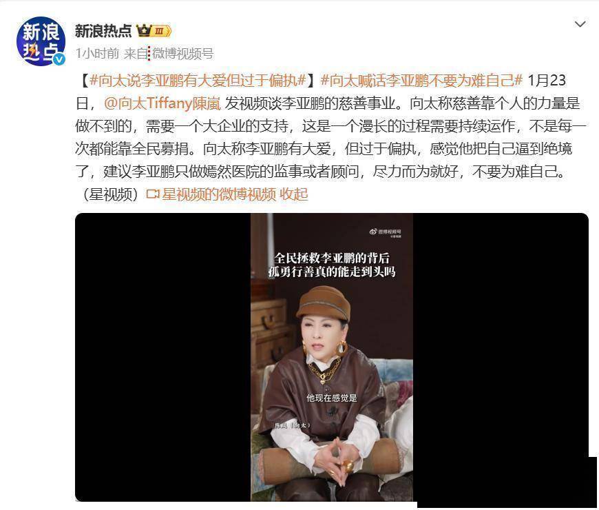 1月23号,向太陈岚一条谈李亚鹏的视频直接把 #向太说李亚鹏有大爱但过于偏执# 顶上热搜,评论区瞬间变成 “公益经营研讨会”。这位在娱乐圈向来敢说真话的 “大姐大”,这次没绕弯子,上来就给李亚鹏的慈善事业做了次 “全身检查”。