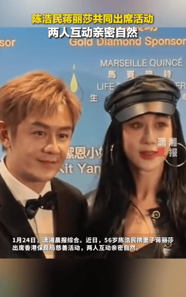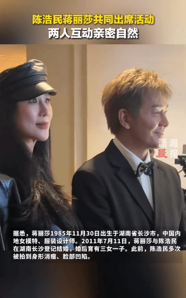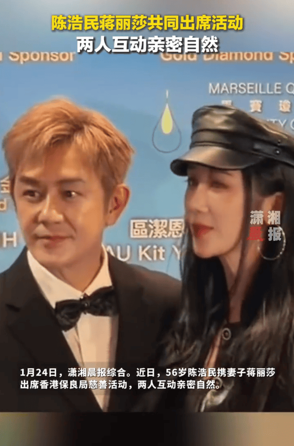 1月24日,潇湘晨报综合。近日,56岁陈浩民携妻子蒋丽莎出席香港保良局慈善活动,两人互动亲密自然。据悉,蒋丽莎1985年11月30日出生于湖南省长沙市,中国内地女模特、服装设计师。2011年7月11日,蒋丽莎与陈浩民在湖南长沙登记结婚,婚后育有三女一子。此前,陈浩民多次被拍到身形消瘦、脸部凹陷。