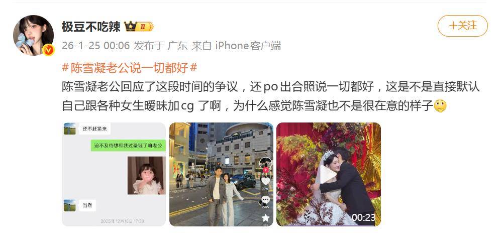 1月24日深夜,深陷出轨风波漩涡的陈雪凝丈夫李瑞滨(Louis),晒出一张夫妻合照,并配文“一切都好”。这波操作,瞬间让本已扑朔迷离的“劈腿连续剧”再添新番,评论区直接炸开了锅。