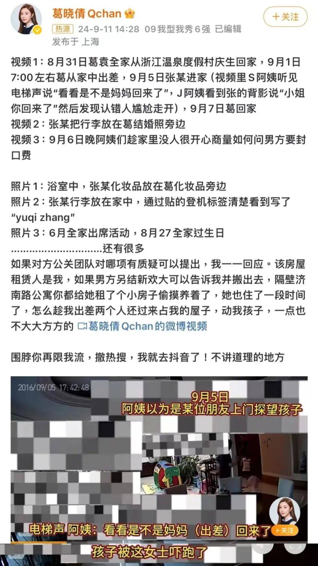 当时孩子和保姆都在家,家中摆着葛女士的婚纱照,张还把化妆品和女主人的化妆品放在一起。等于就是大骂张雨绮是小三!