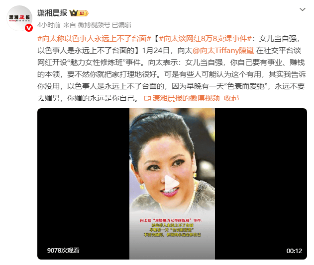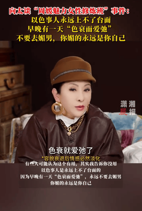 1月24日,向太在社交平台谈网红开设“魅力女性修炼班”事件。向太表示:女儿当自强,你自己要有事业、赚钱的本领,要不然你就把家打理地很好。可是有些人可能认为这个有用,其实我告诉你没用,以色事人是永远上不了台面的,因为早晚有一天“色衰而爱弛”,永远不要去媚男,你媚的永远是你自己。