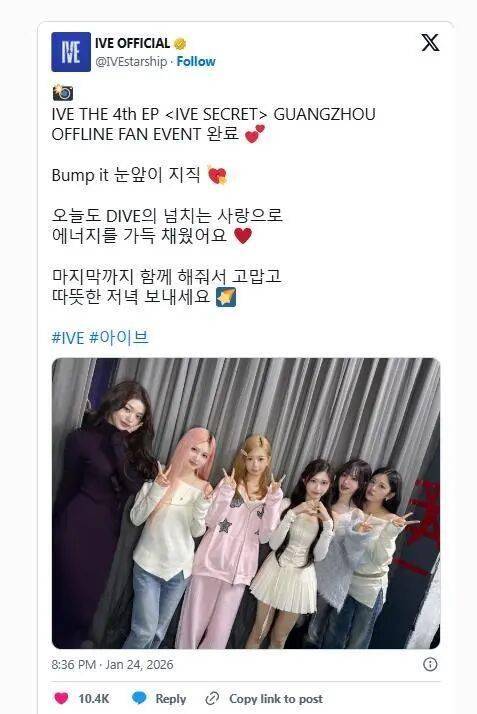 一张看似普通的团体合影,却在韩流粉丝圈里激起了不小的涟漪。1月24日,人气女团IVE在结束广州粉丝签名会后,发布了一张成员们的同框照片。正是这张照片,因其成员间“违反常