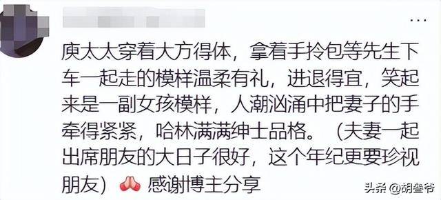 不少网友表示:“庾太太穿着大方得体,拿着手拎包等先生下车一起走的模样温柔有礼,进退得宜,笑起来是一副女孩模样。”