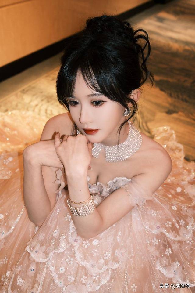 她的礼裙采用了蓬松层叠的裙摆、亮面褶皱材质和粉白渐变配色,在灯光下呈现出与油炸虾片高度相似的纹理和光泽感。