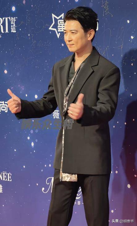 保剑锋身穿黑色西装亮相红毯,深V的设计让他看起来帅气十足。
