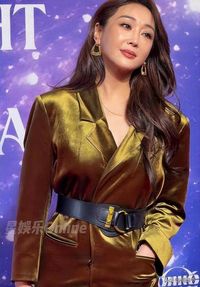 她身穿一套金色西装裙亮相,整体造型干练又不失性感。