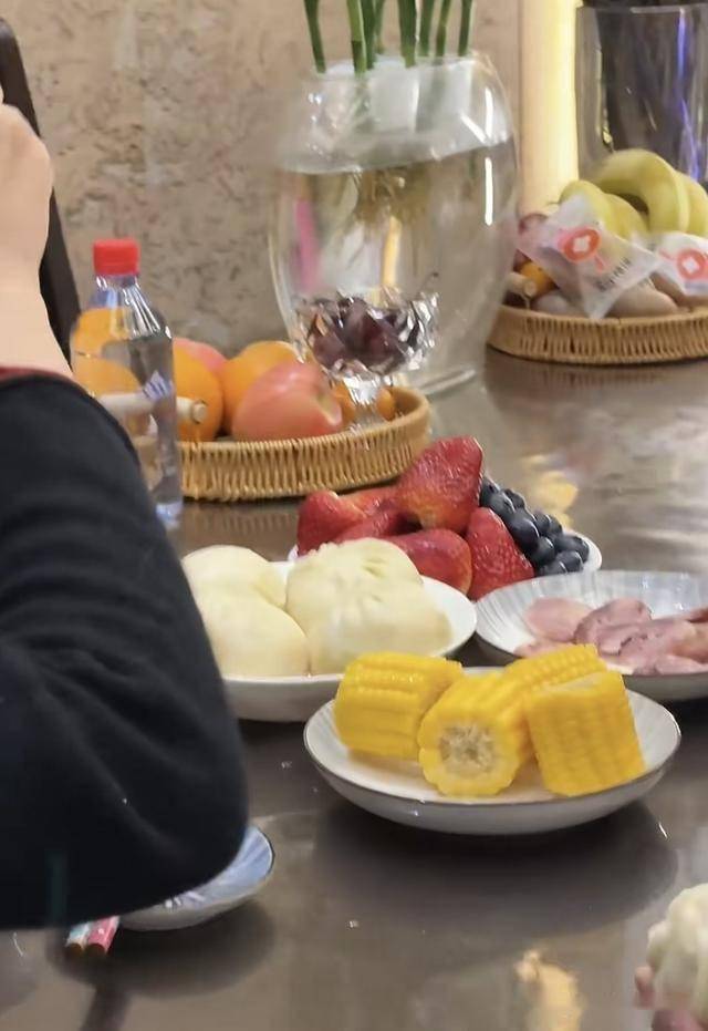 三口人吃的早饭非常简单健康,一盘包子,一盘玉米,还有水果和火腿片,搭配均衡,清淡的口味更适合孩子们。