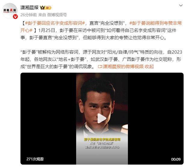 1月25日,彭于晏在采访中被问到“如何看待自己名字变成形容词”这件事,彭于晏直言“完全没想到”,但能够得到大家的夸赞让他觉得非常开心。