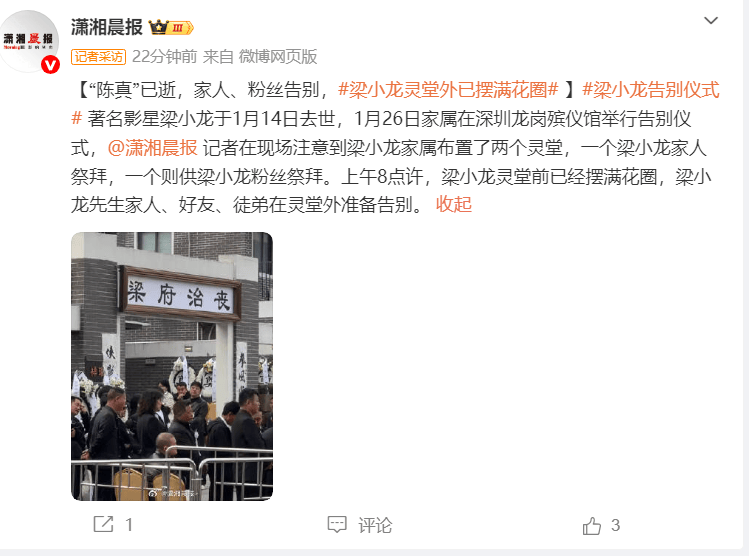 (来源:潇湘晨报)著名影星梁小龙于1月14日去世,1月26日家属在深圳龙岗殡仪馆举行告别仪式,潇湘晨报记者在现场注意到梁小龙家属布置了两个灵堂,一个梁小龙家人祭拜,一个则供梁小龙