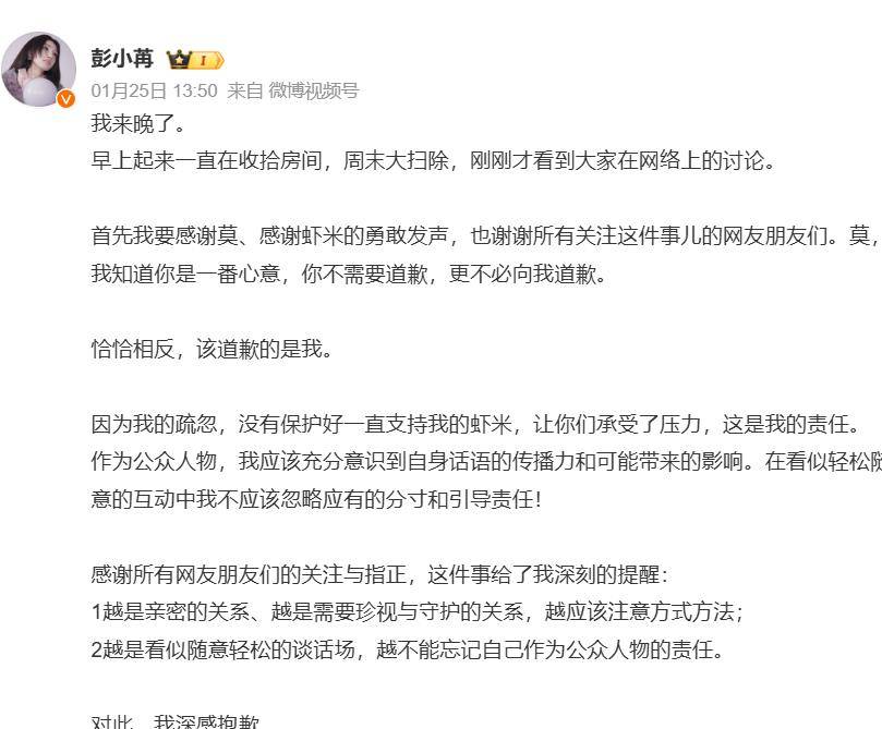 1月25日,彭小苒的道歉视频将事件推向另一面。她素颜出镜,坦言“刚刚才看到网络上的讨论”,并首先保护粉丝:“莫,我知道你是一番心意,你不需要道歉……该道歉的是我。”她将责任归于自身,深刻反思:“作为公众人物,我应该充分意识到自身话语的传播力和可能带来的影响。在看似轻松随意的互动中,我不应该忽略应有的分寸和引导责任!”她承诺今后会更加审慎对待公开互动,谨言慎行,并为其个人事务占用公共资源致歉。视频中“越是亲密的关系,越应该注意方式方法”的总结,透露出此次风波带来的切实警醒。