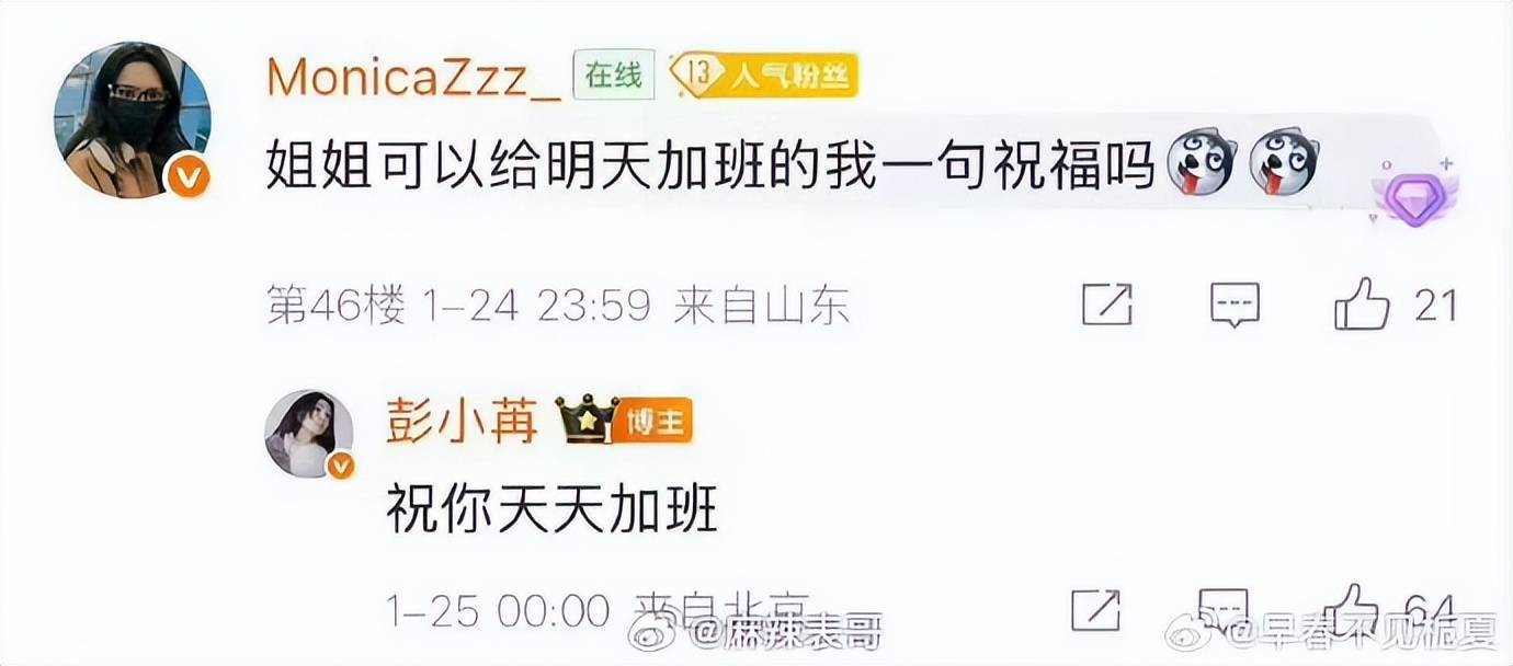事件起源于一位名为“莫妮卡”的七年老粉在彭小苒微博评论区留言:“姐姐可以给明天加班的我一句祝福吗?”彭小苒沿用两人长期以来的互怼模式回复了“祝你天天加班”。该截图被搬运至其他公共平台后,因直接关联社会敏感的职场加班议题,迅速点燃部分网友的情绪,批评声指向艺人“情商低”、“漠视普通人压力”。然而,涉事粉丝随后紧急发文澄清,解释所谓“加班”实为两人圈内关于熬夜玩游戏的玩笑梗,并自责因玩笑不当导致误解,强调彭小苒私下一直维护粉丝,恳请外界勿过度苛责。