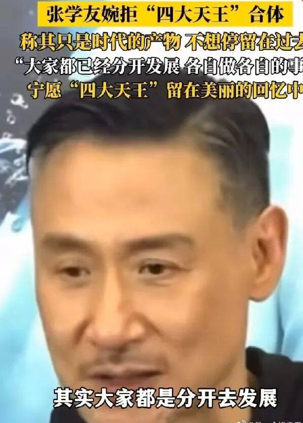 张学友表示:“‘四大天王’只是一个时代的产物,那个时代过后,哪里还有什么‘四大天王’之说呢,大家都已经分开发展,各自做各自的事情,我真的不想停留在过去,我们从来没有自己称自己为‘四大天王’”。