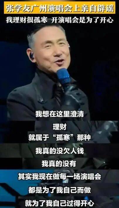 2025年2月28日晚,张学友在广州演唱会现场针对自身的经济状况传闻,明确表示自己没有欠债。