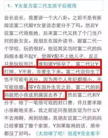 期间有人爆料,何家让Yumi打掉孩子,但女方坚决要生下来,最后四太出面给了一笔不小的封口费买断母子关系,孩子生下后寄养在美国。