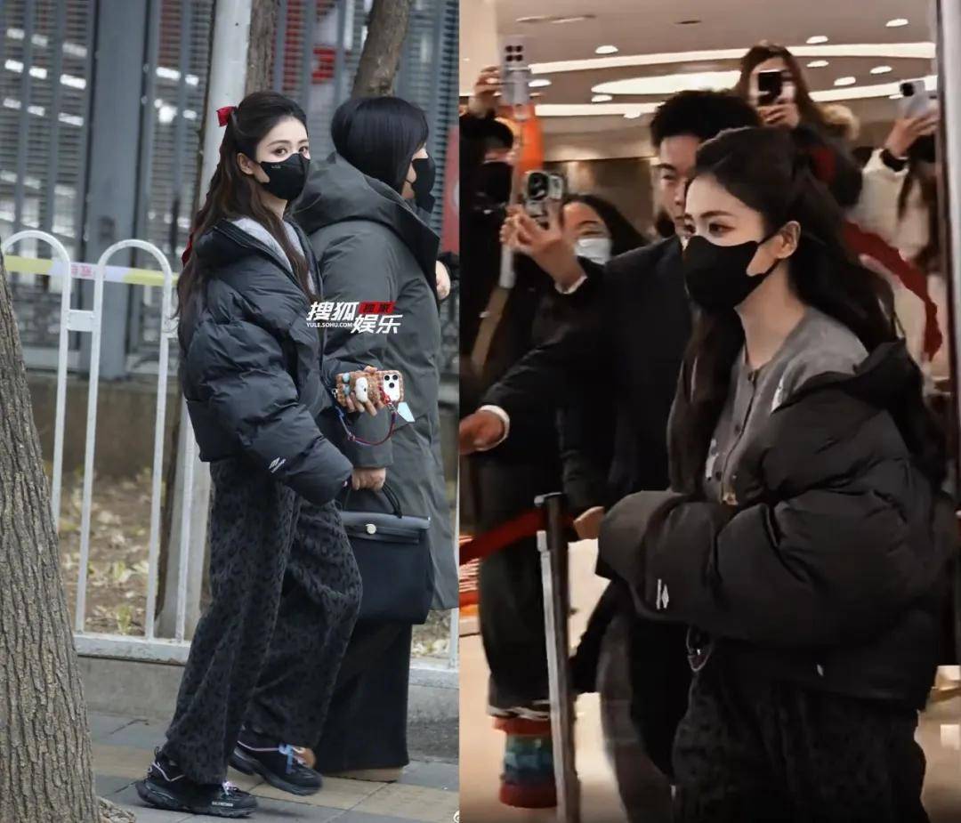 白鹿的穿搭看起来比较随意,全身都是黑色系,短款羽绒服配休闲裤和休闲鞋,很有松弛感。但她始终没有好好穿羽绒服,仿佛在凹造型,头上的红色蝴蝶结也有点瞩目。