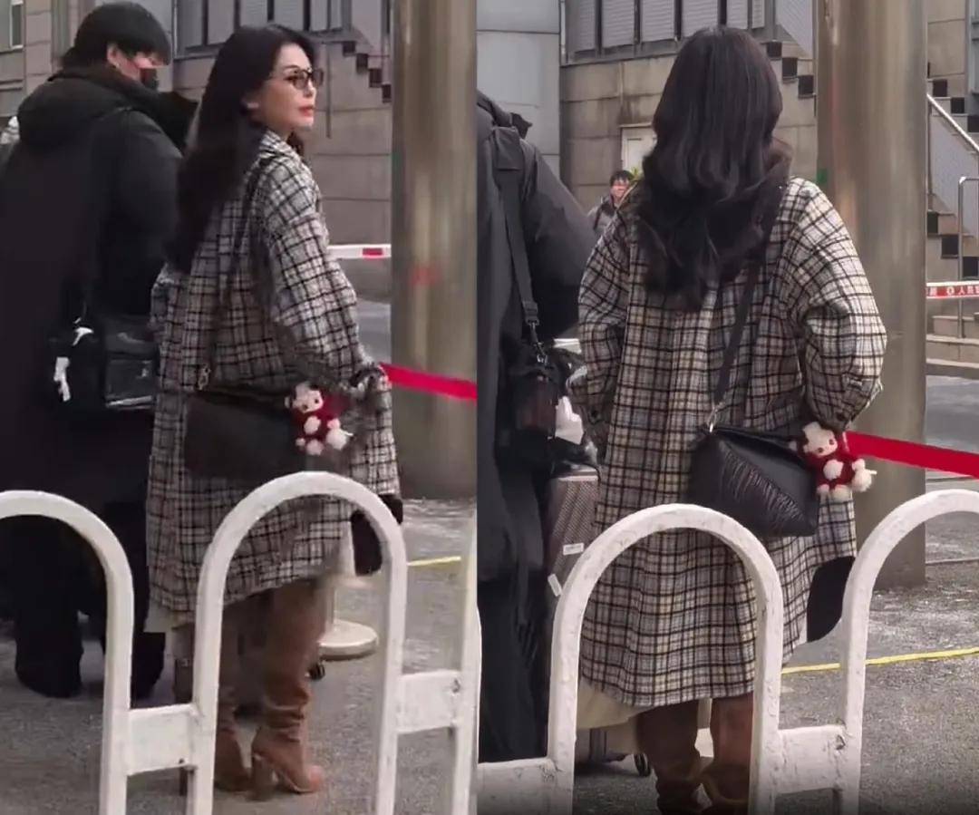 下班时刘敏涛化了全妆,换成一套棕色风衣,还披了一条同色系的披风,保暖且看起来更有亲和力。