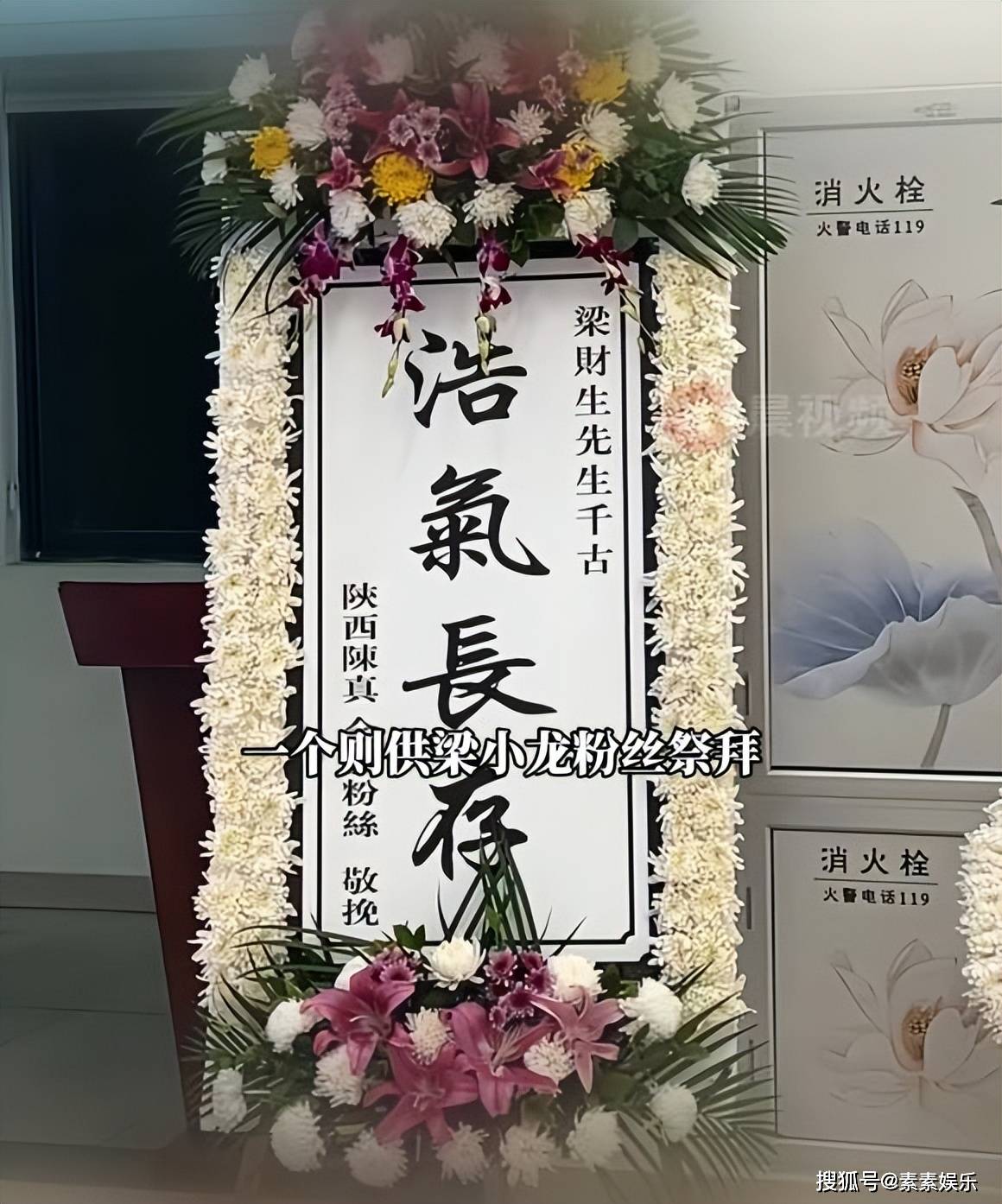 供粉丝和网友缅怀悼念的大厅里已经摆满了鲜花,一位陕西的陈真模仿者送别梁小龙,花圈上写着:浩气长存,粉丝敬挽!