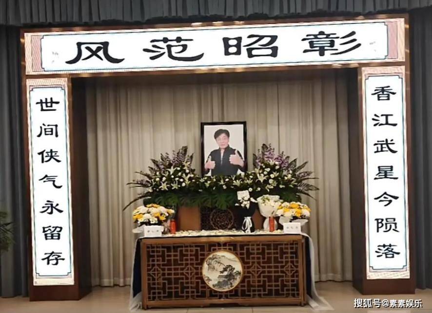灵堂的布置比较简单,显示屏上写着:风范昭彰 香江武星今陨落 世间侠气永留存。