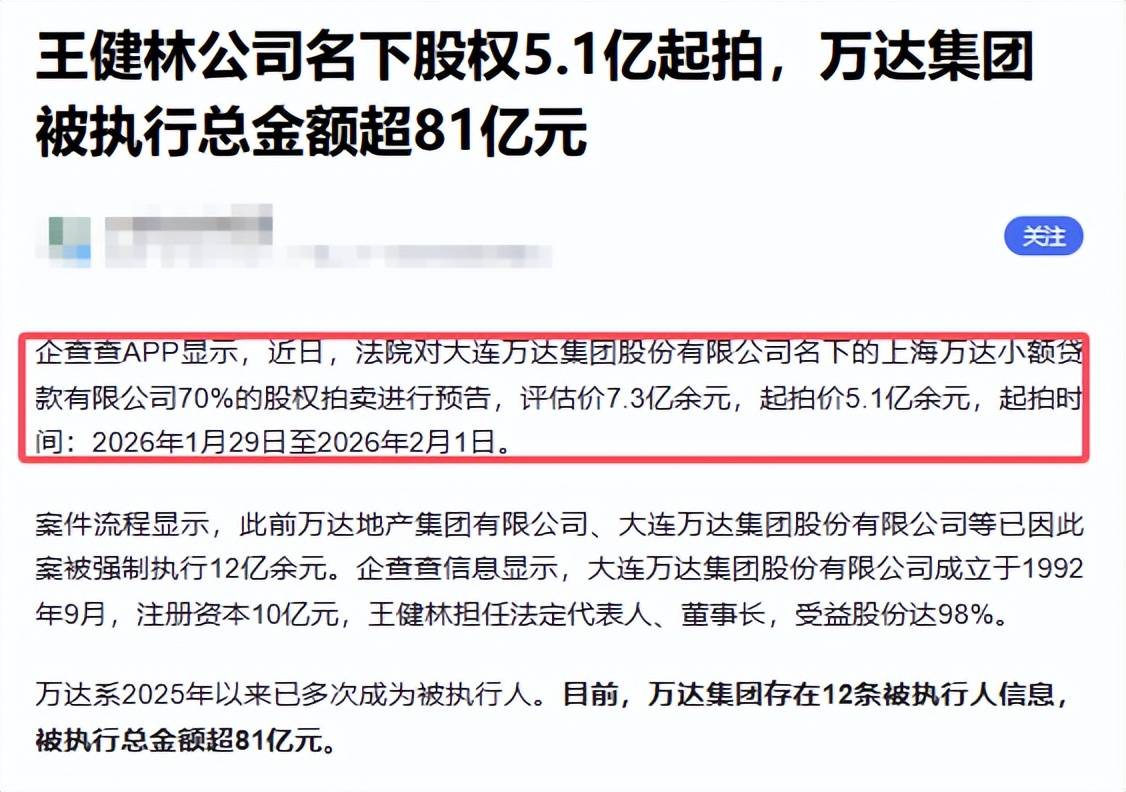 法院刚刚对万达集团名下的上海万达小额贷款有限公司70%的股权进行了拍卖预告,预估价值是7.3亿元,起拍价5.1亿元,起拍时间从2026年1月29日至2026年2月1日。