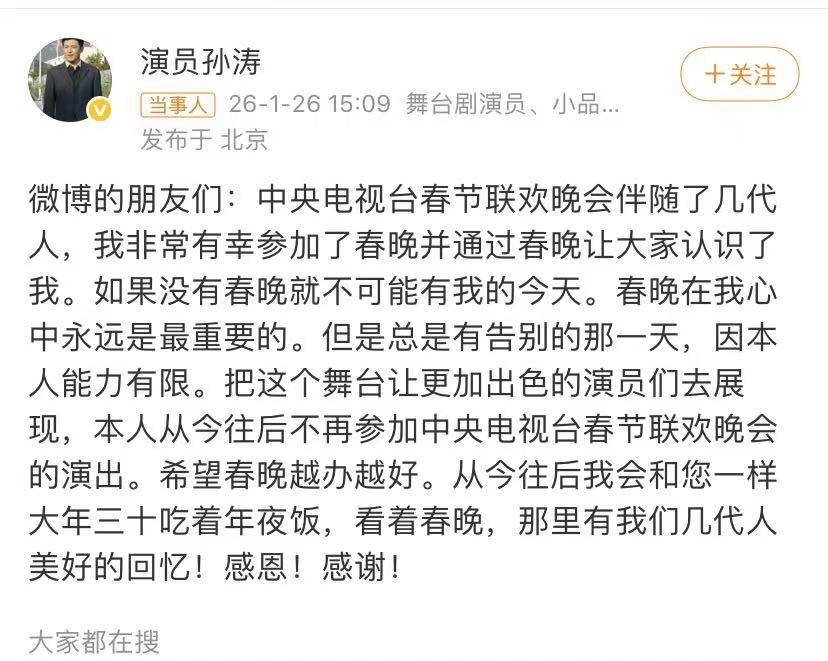 孙涛在发声后发文表示,央视春晚伴随几代人,他非常有幸参加了春晚并通过春晚让大家认识了他,如果没有春晚就不可能有今天的他,春晚在他心中永远是最重要的。但是总是有告别的那一天,因本人能力有限,把这个舞台让更加出色的演员们去展现,本人从今往后不再参加央视春晚的演出。希望春晚越办越好,从今往后自己会和大家一样大年三十吃着年夜饭,看着春晚,那里有几代人美好的回忆,感恩,感谢!