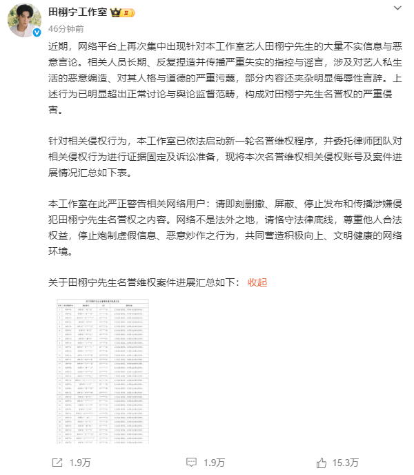 1月26日,田栩宁工作室发文维权,田栩宁工作室写道:“近期,网络平台上再次集中出现针对本工作室艺人田栩宁先生的大量不实信息与恶意言论。相关人员长期、反复捏造并传播严重失实的指控与谣言,涉及对艺人私生活的恶意编造、对其人格与道德的严重污蔑,部分内容还夹杂明显侮辱性言辞。上述行为已明显超出正常讨论与舆论监督范畴,构成对田栩宁先生名誉权的严重侵害。”田栩宁工作室表示:“已依法启动新一轮名誉维权程序,委托律师团队对相关侵权行为进行证据固定及诉讼准备。”