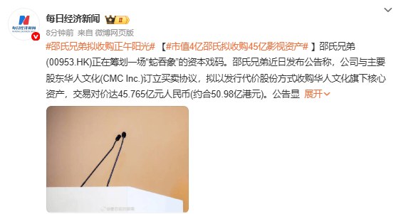 (来源:每日经济新闻)邵氏兄弟(00953.HK)正在筹划一场“蛇吞象”的资本戏码。邵氏兄弟近日发布公告称,公司与主要股东华人文化(CMC Inc.)订立买卖协议,拟以发行代价股