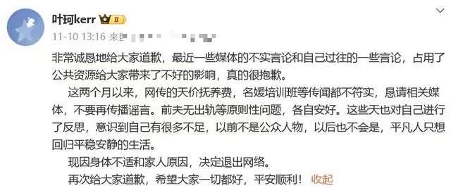 直到,叶珂宣布因“身体不适和家人原因”决定退出网络,围绕他们的种种舆论喧嚣才慢慢归于平静。