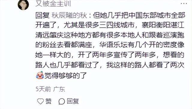 对比圈内的其他歌手,没一个像她这么频繁开演唱会的,其他歌手就算战线拖得比较长,也会稍微控制一下次数,只有她是几乎频繁开遍了各个城市。
