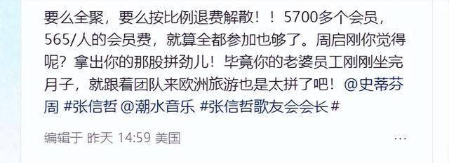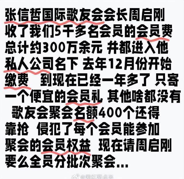 最近张信哲的多位歌迷发声控诉,称现任歌友会会长把歌友会变成了自己的一条财路,收了不少会费,但给粉丝的很敷衍,几乎之前承诺的福利都没有了。